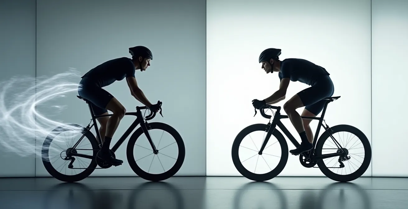 Die gängige Meinung ist, dass Geschwindigkeit gekauft werden muss. Doch was wäre, wenn die signifikantesten Verbesserungen fast kostenlos zu haben sind? Wenn die wahre Bremse nicht das Material, sondern die eigene Körperhaltung und ein paar einfache Ausrüstungs-Kniffe sind? Genau hier setzt die Physik der Aerodynamik an. Es geht nicht darum, blind eine extrem tiefe Position einzunehmen, sondern darum, das Gesamtsystem aus Mensch und Maschine intelligent zu optimieren. Der Schlüssel liegt im Verständnis der physikalischen Hebel, die den Luftwiderstand bestimmen, und in der Fähigkeit, diese anzupassen, ohne dabei wertvolle Tretleistung zu opfern.